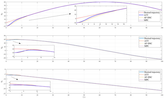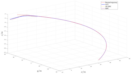Aiming at a single AUV, Figure 9 presents the three-dimensional trajectory tracking results, while Figure 10 displays the desired and actual trajectories along the three axes. Compared to AF-DSC and MPC, the ATT has a faster response speed and reduced overshoot in trajectory tracking. In addition, the tracking accuracy has also been improved. In practical underwater environments, by utilizing the adaptive fixed-time trajectory tracking methods, system speed and stability can be enhanced, which will contribute to improved trajectories tracking performance.