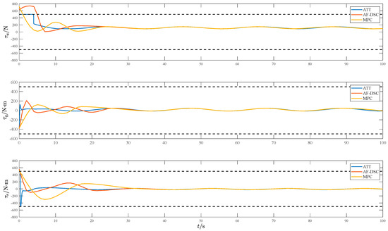 Figure 11 depicts the control input of the underactuated AUV. As shown in Figure 10, compared with AF-DSC and MPC, the control inputs in the ATT Layer can be limited to within the prescribed ranges because of the designed auxiliary compensation system when suffering from the issue of input saturation. Based on the above analysis, it can be concluded the proposed hierarchical adaptive fixed-time controllers are reliable and can achieve a better formation performance.