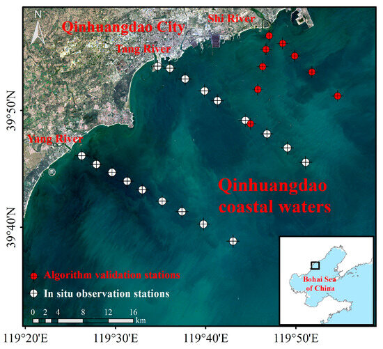 Qinhuangdao, located on the west coast of the Bohai Sea in northeastern China, is an important coastal city known for its tourism and port activities. The hydrodynamic conditions in its coastal waters are relatively weak, resulting in clearer seawater compared to other coastal regions of the Bohai Sea. In this study, three field survey sections were established in the coastal waters, starting from the mouths of the Tang, Yang, and Shi Rivers. To examine the spatial and temporal shifts in regional transparency, a remote sensing inversion model for water SDD was subsequently created using the obtained data (Figure 1).