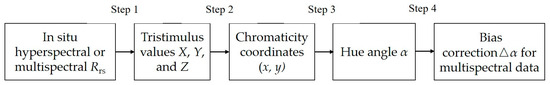 Consequently, we needed to convert the hue angle calculated using Wang S.L. et al.’s definition to the hue angle defined by Woerd and Wernand [36] (the sum of the two hue angle definitions equals 270). Subsequently, we applied bias correction using Equation (11) as fitted by Woerd and Wernand. Finally, after bias correction, the hue angle was converted back to Wang S. et al.’s definition for further model development.