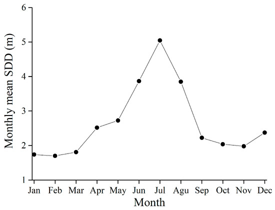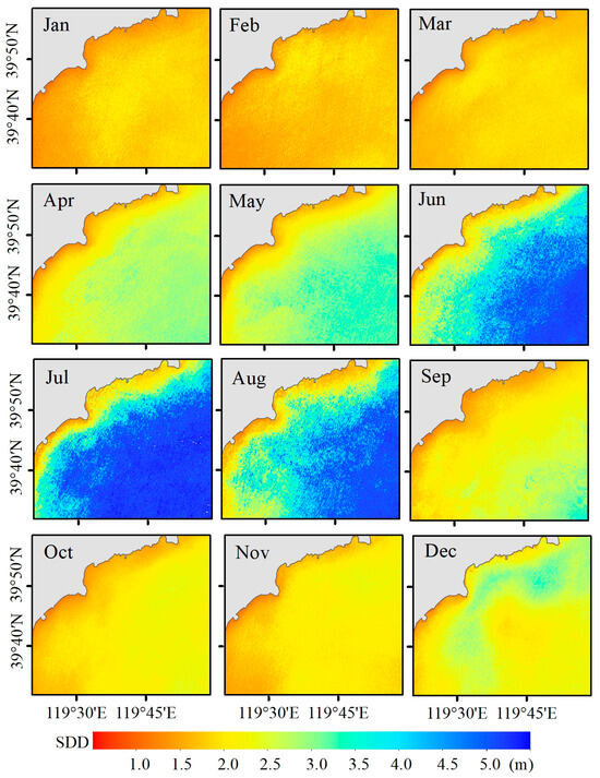 Temporally, the lowest SDD values in the Qinhuangdao coastal waters are observed from January to March and from September to December, with moderate levels in April and May. The highest SDD occurs from June to August. Further statistical analysis indicates that the monthly mean SDD generally follows a trend of rising and then declining over the year, as depicted in Figure 4. The minimum value of the SDD is observed in February, with a monthly mean of 1.70 m. This gradually increases to a peak in July, reaching a monthly mean of 5.05 m, before decreasing again.