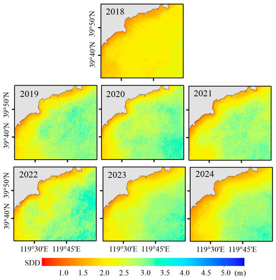 Spatiotemporal variation in the annual SDD in the Qinhuangdao coastal waters (2018–2024).