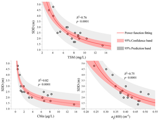 The field-measured SDD was found to be negatively correlated with the three water-color constituents—TSM, Chla, and CDOM absorption (ag(400))—as shown in Figure 7.