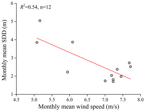 Furthermore, Qinhuangdao’s coastal waters are located within the East Asian monsoon zone. This region is characterized by a sea surface wind field displaying prominent seasonal patterns. In winter, northwesterly winds prevail, with stable directions and stronger intensities. In contrast, summer sees southeasterly winds, which are weaker and more variable. Spring and autumn serve as transitional periods, marked by fragmented and unstable wind directions. This seasonal variation corresponds to changes in the SDD of the Qinhuangdao coastal waters from January to December, with stronger winds typically decreasing the SDD and weaker winds leading to higher SDD. A negative correlation exists between the mean monthly wind speed and the mean SDD (Figure 8), reinforcing the idea that the monthly variation in SDD is closely tied to surface wind speed. However, no correlation was found between the mean interannual wind speed and the mean SDD (Figure 9), suggesting that the interannual variation in SDD is not obviously influenced by sea surface winds and is likely driven by other factors.
