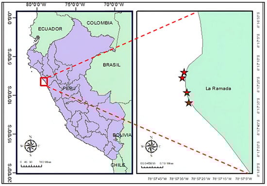 Geographic location of La Ramada beach in the Salaverry district, La Libertad, Peru (image created by marine biologist Max Castañeda-Franco). The stars on the map indicate the area where there is a greater presence of the macroalga C. chamissoi.