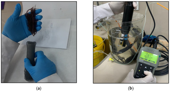 Chondracanthus chamissoi propagule propagation system under laboratory conditions. (a) Introduction of the algae into the meshes; (b) measurement of parameters using the HANNA HI9829 multiparameter meter in the propagation system used in the laboratory.