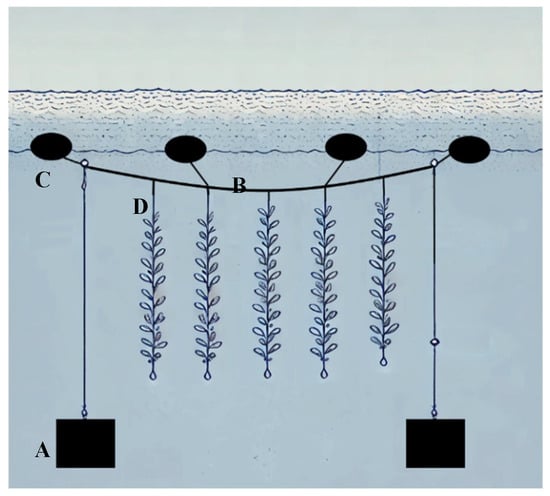 Diagram of the semi-suspended tree-type cultivation system. (A) Anchor, (B) mother line, (C) buoys, and (D) net with the cultivation of C. chamissoi.