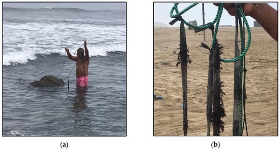 This process was carried out using a semi-suspended tree-type cultivation system between the months of October 2022 and February 2023. During this period of time, the microbiological and physical–chemical quality of the seawater was analyzed. While the macroalgae were evaluated post-harvest, the microbiological and nutritional quality of the culture were compared with those obtained from the samples collected from the natural seaweed bank. This system consisted of a ¾ raffia with a buoy attached at one end and anchored to a 15 kg weight at the other end. Along the raffia, mesh structures containing the C. chamissoi propagules were positioned during the propagation stage (Figure 3 and Figure 4) [41].