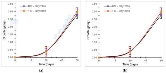 Growth rate of C. chamissoi evaluated in propagation systems with 0 and 1% Bayfolan. (a) Evaluation carried out between June and August 2022 and (b) evaluation carried out between September and November 2022.