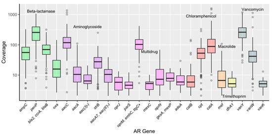 We detected a total of 24 out of 102 possible AR gene types that were present in at least 5% of samples. The 5% sample threshold is often applied to taxonomic filtering and has been shown to reduce the complexity of microbiome data while preserving downstream analysis, reduce technical variability, and result in more comparable and reproducible results []. One out of twenty-four AR genes did not consist of any genes present within the Comprehensive Antibiotic Resistance Database, which documents classified AR genes []. This gene is penP (Table 1), but penP is known to confer beta-lactam resistance in Bacillus []. We determined the coverage values of the 24 AR genes (Figure 1). Median coverage values ranged between 8 and 450 reads per gene bp. With an average sequencing depth of 13.6 Gbp per sample and average genome length of 2.36 Mbp per sample [], the observed coverage indicates that between approximately 1:1000 and 1:13 cells contain at least one AR gene copy. The average prokaryotic cellular abundance in the euphotic zone at the nearby SPOT time series was 2 × 106 cells/mL over 10 years []. Thus, a very rough estimate of AR gene abundance in our time series is that it ranges between approximately 2.8 × 103 and 1.6 × 105 gene copies/mL. A recent transect from the western Pacific to the Southern Ocean used quantitative PCR to determine that AR gene abundances ranged between 1.4 × 106 and 7.8 × 106 copies/mL []. Therefore, our metagenomically estimated AR gene abundances were an order of magnitude lower and may have been impacted by detection limits, but were generally within the range expected for marine environments. We identified four beta-lactamase, five aminoglycoside, seven multidrug, three chloramphenicol, one macrolide, one trimethoprim, and three vancomycin resistance gene types. There was variability in coverage within each antibiotic category, but beta-lactamase and vancomycin resistance genes were the most prevalent (Figure 1). penP (class A beta-lactamase) and vanY (vancomycin resistance gene) had the highest coverage [,,].