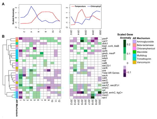 (A): Monthly and annual anomaly in temperature (red line) and chlorophyll (blue line). (B): Seasonal and interannual trends in antibiotic resistance genes present in at least 5% of samples. Linear model regression coefficients for normalized gene coverage as a function of month (1–12) and year (2012–2020) (see Methods). Each month is aggregated across years. Coefficients were scaled to center on zero. The regression model uses January and the first year of the time series (2011) as the reference category for month and year coefficients, respectively. A higher coefficient means an increasing trend in that month or year. Genes are color-coded by resistance mechanism. Anomalies were found by fitting linear models with 12 monthly and yearly levels, centered, and scaled for presentation.