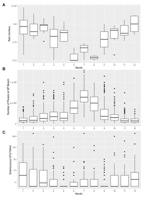 (A): Monthly precipitation at the Newport Beach Harbor, CA National Oceanic & Atmospheric Administration station from 2011 to 2020. Data for January 2011 and May 2012 is not available. (B): The number of monthly visitors at Newport Beach, CA from 2015 to 2020. Data was obtained as a public records request from the City of Newport Beach. (C): Monthly Enterococcus levels at the State of California Water Boards 15S station located at 15th/16th St. in Newport Beach, CA from 2011 to 2020. The boundary of the box closest to zero indicates the 25th percentile, and the boundary of the box farthest from zero indicates the 75th percentile. The black line within the box marks the median. Points indicate outliers.