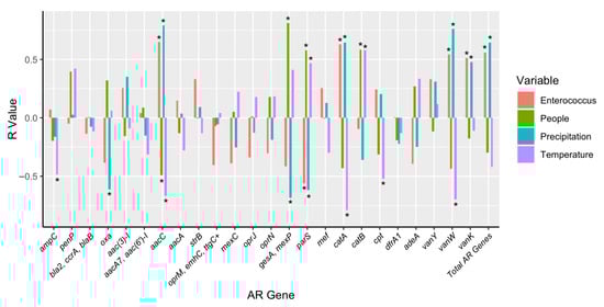 Pearson correlation coefficients (R values) for the correlation between AR gene coverage and Enterococcus levels, number of people, precipitation levels, and temperature at Newport Beach, CA. The linear model regression coefficients as a function of the month and year for AR gene coverage, Enterococcus levels, and precipitation levels were used to obtain the Pearson correlation coefficients. *, p ≤ 0.05.