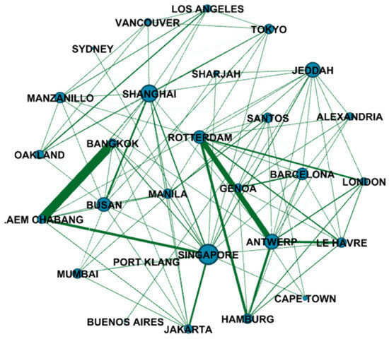 In this study, a shipping network is established with ports as nodes and direct routes between ports as edges. The network comprises 28 nodes, 218 edges, 125.21 independent paths, and has a network efficiency of 0.61. Additionally, Gephi 0.9.2 software is utilized to generate a visualization of the shipping network, with node dimensions reflecting the degree of the ports, and the widths of the edges mapping the frequencies of the routes, as shown in Figure 1 below.
