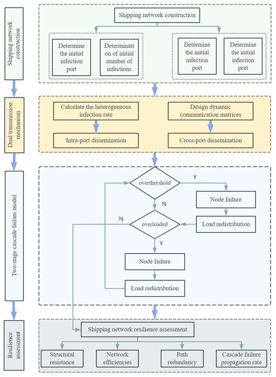 To address these gaps, this paper proposes a two-stage cascading failure model combined with a dynamic load allocation strategy. By setting infection thresholds to trigger direct failures and using dynamic load redistribution to induce indirect failures, the model reveals the dynamic evolution of shipping network resilience under epidemic impacts. Furthermore, a dynamic weight allocation strategy is introduced, integrating residual capacity and infection risk considerations to provide a theoretical foundation for port load scheduling during epidemics. A multidimensional resilience assessment index system is also constructed, incorporating structural destruction resistance, network efficiency, path redundancy, and cascading propagation rates. This system breaks through the limitations of single topology index assessments and offers decision-making support for optimizing shipping network resilience.
