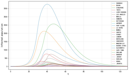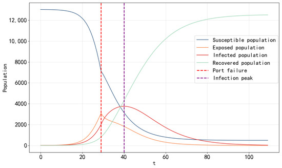 - This study couples the SEIR model with the shipping network topology, breaking through the traditional port resilience assessment paradigm based on static disruptions. This framework can quantitatively analyze the dual dynamic processes of epidemic transmission and shipping network topology evolution driven by load redistribution and cascading port failures. By introducing an infection rate function that characterizes node heterogeneity, it reveals the key impact of port connectivity indicators and epidemic control intensity on the speed and scope of epidemic transmission. Results show that the risk quantification is highly effective: it accurately predicted that the Port of Shanghai closed on day 40 due to infection levels exceeding the threshold, and despite bearing 28.9% of the Port of Shanghai’s load redistribution, the Port of Singapore successfully avoided secondary failure due to its high remaining capacity and low infection risk. Therefore, the model effectively captures the spatiotemporal characteristics of epidemic transmission between ports, providing a more precise quantitative tool for risk assessment.