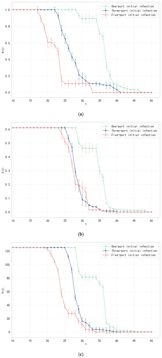 In order to explore the impact of the number of initial infection sources on the resilience of the shipping network, this study designed three outbreak scenarios for comparative experiments: single-port outbreak—the above seaport is the initial infection source, simulating the number of infected people spreading from 10 cases and analyzing the spatial and temporal spreading paths of the cascade failure; three ports at the same time—selecting the Port of Busan (Asia), the Port of Santos (South America), and the Port of Rotterdam (Europe) as the simultaneous infection source, with the initial number of infected people as 10 cases each to explore the impact of multi-source propagation on network load redistribution; five-port simultaneous outbreak—the Port of Cape Town (Africa) and the Port of Sydney (Oceania) are added as the infection sources, and the initial number of infected people is 10 cases each to verify the resilience limit of the network under the impact of an extreme epidemic. For each scenario, the experiment was independently repeated 20 times, and the average values of each indicator were calculated. The variability of the indicator values for each scenario is displayed through vertical error bars (95% confidence interval) on the trend line.
