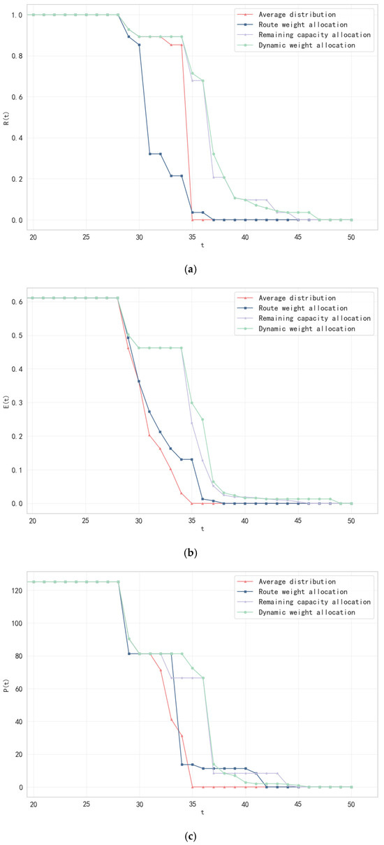 - Cascade failure propagation rate suppression: The dynamic weight allocation strategy significantly slows the growth of cascade failure propagation rates. By day 34, its propagation rate is 0.1071, which is 57.16% lower than both the average allocation strategy (0.25) and the residual capacity policy allocation (0.25), and 88% lower compared to the route weighting strategy (0.8929). This can be attributed to the dual constraints of the dynamic weighting formula: first, it prevents excessive load concentration on a small number of nodes; second, it restricts load reception at high-risk nodes.