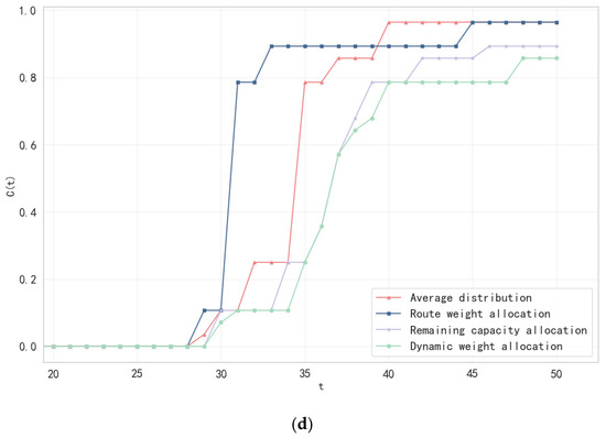 To further verify the effectiveness of the dynamic weight allocation strategy, this study compares four load redistribution mechanisms: average allocation (homogenized load transfer), route weight allocation (based on route frequency), residual capacity allocation (prioritized allocation to low-load nodes), and dynamic weight allocation (combining residual capacity and infection risk as described in Equation (13)). The analysis begins with the failure state of a single-port outbreak as the initial condition. Simulations compare the dynamic changes in network resilience under different load redistribution strategies.