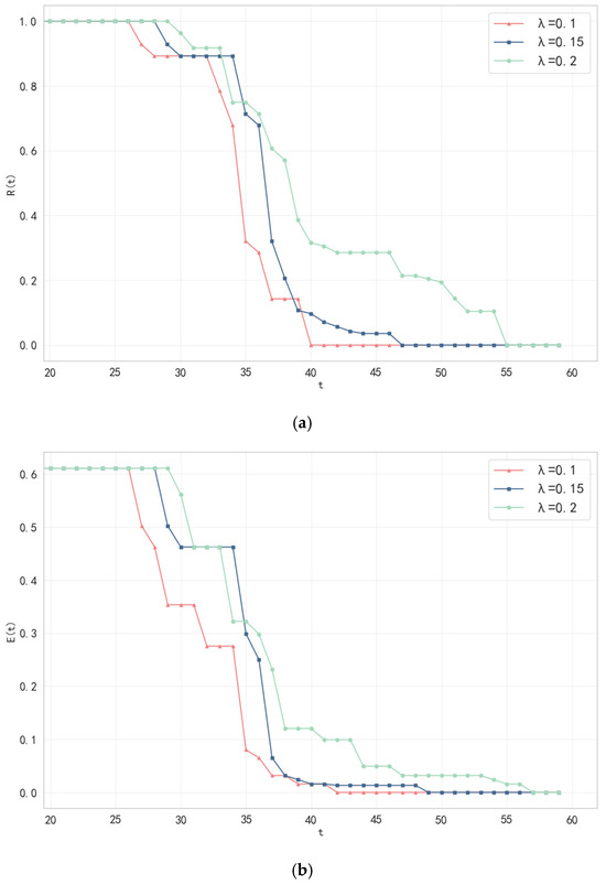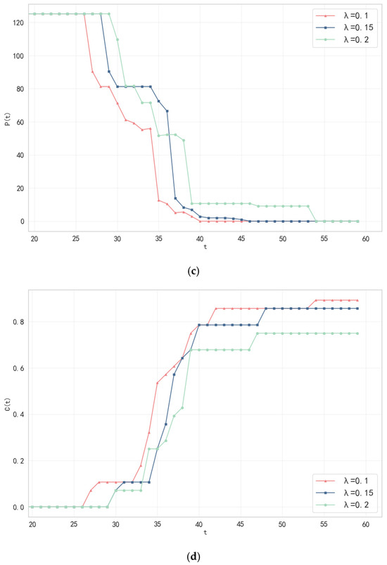 Based on the results of the sensitivity analysis experiment shown in Figure 7, this paper selects λ = 0.15 as the optimal threshold for adjusting the resilience of the shipping network under the impact of the epidemic. Time-series evolution data indicate that when λ = 0.15, the network begins to collapse at t = 28 days, delayed by 10% compared to λ = 0.1, but does not completely collapse until t = 43 days, delayed by 7.5% compared to λ = 0.1, thereby forming a 15-day golden regulatory window. In contrast, when λ = 0.1, the network collapses at t = 40 days, with the peak value of the cascading failure propagation rate C(t) reaching 0.85, leading to the premature failure and closure of ports, causing a large accumulation of goods and triggering cascading failures, resulting in certain economic losses. When λ = 0.2, although the collapse is delayed to t = 55 days, the relaxed strategy allows many infected ports to remain operational, which actually increases the risk of cross-port transmission of the epidemic. This could ultimately lead to the entire shipping network becoming paralyzed, with a prolonged collapse period of 26 days causing the network efficiency E(t) to remain below 0.3 for over 30 days, resulting in severe resource idleness.