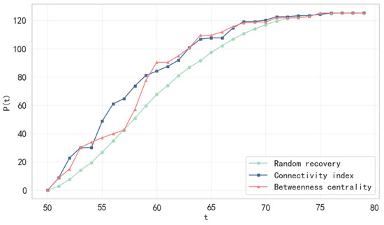 To evaluate the impact of recovery strategies on the resilience of the shipping network after an epidemic shock, three recovery strategies were developed in this experiment: prioritizing the recovery of ports with high connectivity based on the port connectivity index (Table 4), prioritizing the recovery of ports with high meso-centrality based on the meso-centrality index (Table 4), and randomly selecting failed ports for recovery.