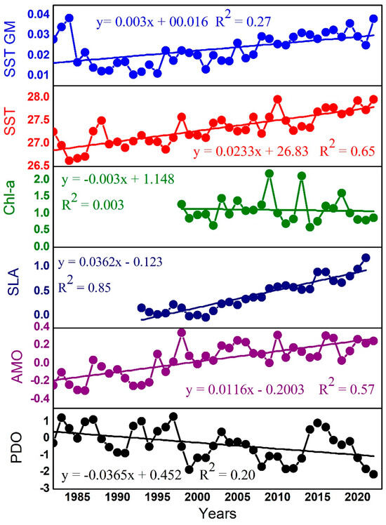 3.1. Decadal Variations in SST and SST GM
