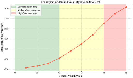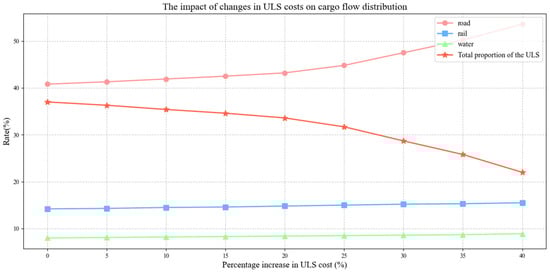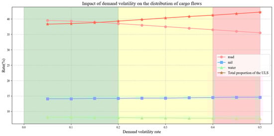 - Demand uncertainty: As demand uncertainty increases, the proportion of road transport rises, and the proportion of the underground logistics system slightly decreases. A shallow underground logistics system shows better adaptability.