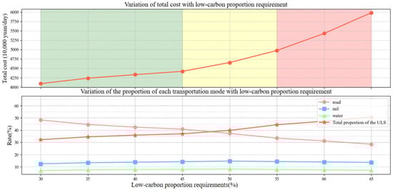 - Low-carbon-proportion requirements: When the low-carbon-proportion requirement is below 45%, the system can adapt with a relatively small increase in cost. However, when the requirement exceeds 50%, costs rise significantly.