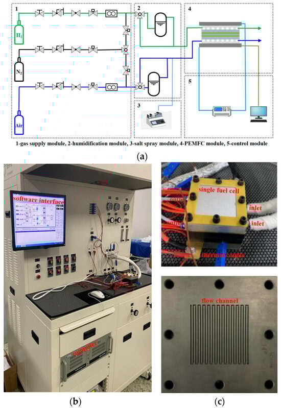 (a) A diagram of the PEMFC test system, (b) a photo of the experimental setup, and (c) the single fuel cell and the flow field plate.