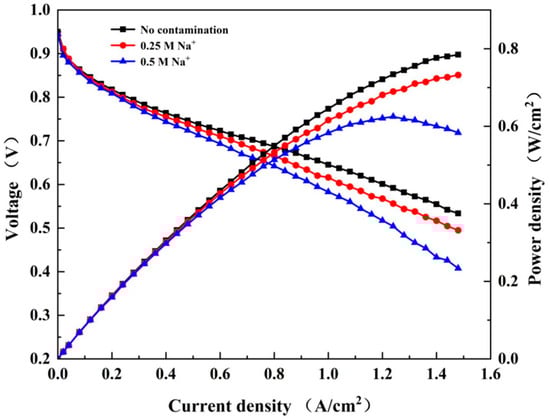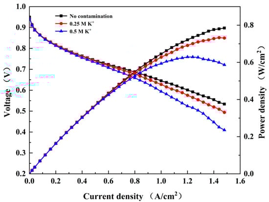 The effect of monovalent cations (Na⁺ and K⁺) on cell performance is presented in this section. The effect of K+ contamination on cell performance in terms of the polarization curve and power density curve is shown in Figure 2. It was observed that cell performance could be greatly affected by increasing the K+ concentration and current density. When the fuel cell was not contaminated, the voltage was 0.645 V at a current density of 1 A/cm2. When the K+ concentration was 0.25 M, the cell voltage was 0.628 V. When the K+ concentration was 0.5 M, the cell voltage was 0.594 V. Compared to the fuel cell without contamination, the cell voltages decreased by 17 mV and 51 mV, respectively. Meanwhile, the corresponding power densities decreased by 2.636% and 7.906%, respectively. The polarization and power density curves of fuel cells with Na+ contamination are demonstrated in Figure 3. When the Na+ concentrations were 0.25 M and 0.5 M, the corresponding cell voltages were 0.616 V and 0.583 V, respectively. Compared to the fuel cell without contamination, the cell voltages decreased by 29 mV and 62 mV, respectively. The corresponding power densities decreased by 4.496% and 9.612%, respectively. The protons generated in the cathode CL were transported to the anode CL through the membrane. The ohmic loss of the fuel cell was mainly caused by the proton transport in the membrane. Foreign cations have a higher affinity for the sulfonic acid group than for H+ protons. When the fuel cells were contaminated by foreign cations, the protonic conductivity was reduced. The ohmic loss accordingly increased, and cell performance degradation was also observed.