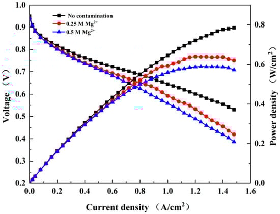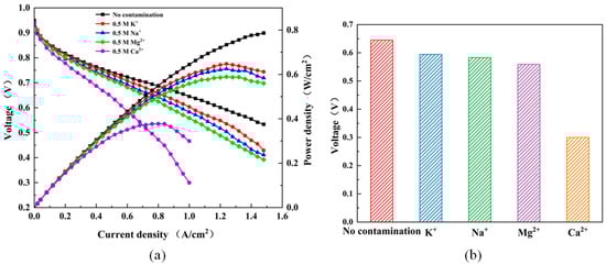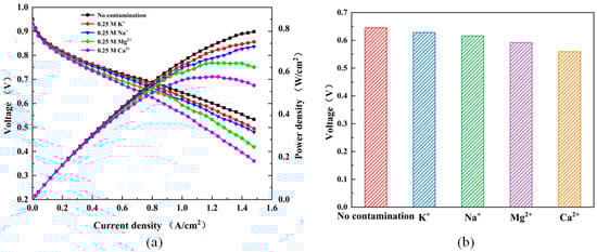 Meanwhile, the effect of the cation contamination type on cell performance was also investigated. The corresponding polarization and power density curves were summarized and compared, as illustrated in Figure 6 and Figure 7. The cation concentrations were 0.25 M and 0.5 M, respectively. It was observed that cell performance was significantly affected by the cation type. The worst cell performance was observed when the fuel cell was contaminated by Ca2+, followed by Mg2⁺, Na⁺, and K⁺. It was also noticed that the effect of Ca2+ on cell performance became more pronounced when the cation concentration increased. The degradation of fuel cell performance caused by contamination by divalent cations (Ca2+ and Mg2⁺) was more severe than that caused by contamination by monovalent cations (Na⁺ and K⁺). The existence of cations can reduce proton conductivity, increase electro-osmotic drag, and reduce the water content [].