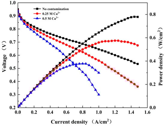 The effect of divalent cations (Ca2+ and Mg2⁺) on cell performance is presented in this section. Figure 4 presents the performance of fuel cells with Mg2+ contamination. When the Mg2+ concentrations were 0.25 M and 0.5 M, the corresponding cell voltages were 0.594 V and 0.559 V, respectively. Compared to the fuel cell without contamination, the cell voltages decreased by 51 mV and 86 mV, respectively. The corresponding power densities decreased by 8.062% and 13.333%, respectively. The performance of fuel cells with Ca2+ contamination is illustrated in Figure 5. When the Ca2+ concentrations were 0.25 M and 0.5 M, the cell voltages were 0.560 V and 0.300 V, respectively. Compared to the fuel cell without contamination, the cell voltages decreased by 85 mV and 345 mV, respectively. The corresponding power densities decreased by 13.137% and 53.488%, respectively.