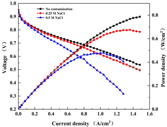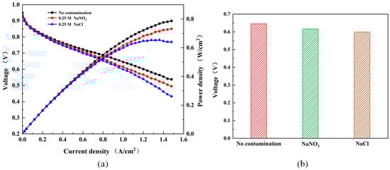 Fuel cells contaminated by 0.25 M and 0.5 M NaNO3 and NaCl are compared in Figure 9 and Figure 10. Compared to the fuel cell without contamination, the voltages of fuel cells contaminated by 0.25 M NaNO3 and NaCl were reduced by 29 mV and 45 mV, respectively. When the concentration was increased from 0.25 M to 0.5 M, the corresponding voltages were reduced by 62 mV and 168 mV, respectively. It can be seen that the performance of the fuel cell contaminated by NaCl was much worse than that of the fuel cell contaminated by NaNO3. Due to the existence of Cl−, more severe performance degradation was observed. This was because Cl− was easily adsorbed on the surface of the Pt catalyst and the active sites for the electrochemical reactions were reduced. Meanwhile, Cl− could also induce dissolution of the Pt catalyst [].