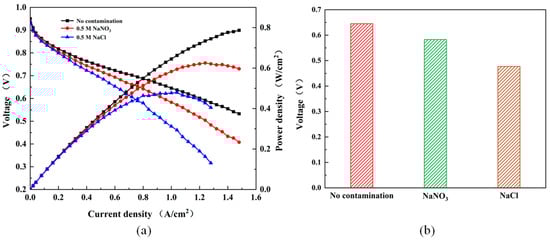 The performance of fuel cells contaminated by 0.5 M NaNO3 and NaCl: (a) polarization curves and power density curves, (b) the cell voltage at a current density of 1.0 A/cm2.