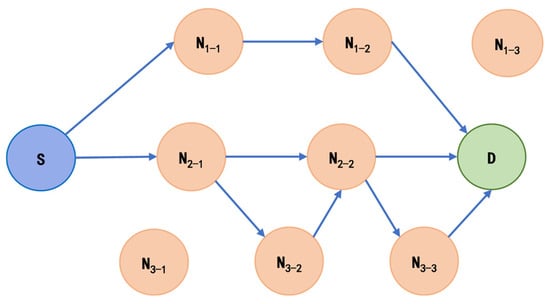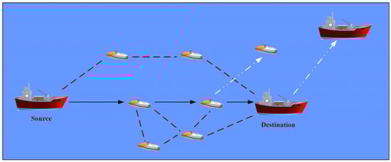 Figure 13 illustrates the M-MANET communication scenario. Multiple potential routing paths exist between the source and destination nodes, depicted by red dashed lines without arrows, while the chosen routing path is indicated by black solid lines with arrows. Taking one USV and the destination node as an example, white dashed lines with arrows are used to represent their directions of movement. In the experiments, USVs are the relay nodes, and the cargo vessels are the source nodes and the destination nodes. Specifically, one cargo vessel acts as the source node, responsible for generating and sending data packets, while another cargo vessel functions as the destination node, receiving the transmitted information. USVs play critical roles in ensuring reliable and efficient communication by relaying signals, particularly in scenarios where direct communication between the source and destination nodes may be hindered by long distances.