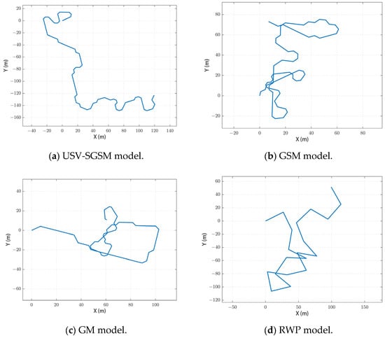 Figure 10, in the cyclotronic motion phase, the proposed USV-SGSM model has a suitable steering radius, and its trajectory is smooth, while the steering trajectories of the remaining three models show abrupt changes with obvious inflection points. In the straight-line motion phase (including variable velocity and stable motion phase), the trajectory of the USV-SGSM model shows a slight offset, which is in line with the straight-line motion of the USV under the action of waves, while the trajectories of the remaining three models show a stable straight line. Therefore, the characteristics of the USV-SGSM model are more in line with the real movement characteristics of USV when it is traveling on the sea surface and can more accurately simulate the motion state of the USV, thus laying the foundation for the subsequent simulation of the relevant network performance.