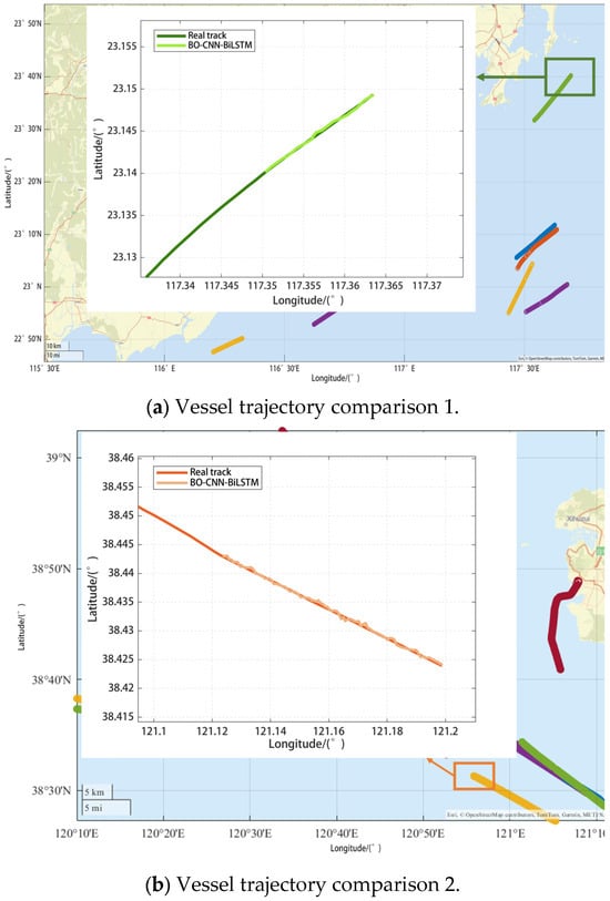 Comparison of the predicted trajectories obtained by BO-CNN-BiLSTM and real vessel trajectories are shown in