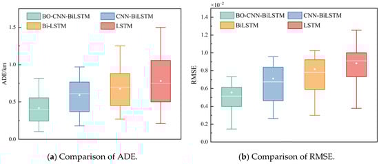 Figure 12a,b. The BO-CNN-BiLSTM model shows significant improvements in all three metrics compared to the CNN-BiLSTM algorithm, where the RMSE, Maxerr, and ADE are reduced by 20.77%, 50.36%, and 29.37%. This demonstrates that it can fully utilize the trajectory information extracted from historical trajectories, it has lower performance variance, and effectively improves the trajectory prediction model performance in terms of accuracy and computational efficiency. Moreover, when handling long-term forecasting tasks, it is able to maintain excellent performance.