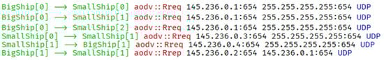 Figure 14 shows the detailed data interaction log graph between two vessel nodes of M-MANET intercepted in OMNET++ (OMNet++4.6). As shown in the figure, the cargo vessel node 0 first transmits the data packet to the USV nodes 0, 1, and 2, and after USV node 0 successfully receives the data packet and completes the next-hop node selection, it forwards the data packet to USV node 1. Finally, it is sent through the USV node 1 to complete the transmission of the data packet to the cargo vessel node 1.