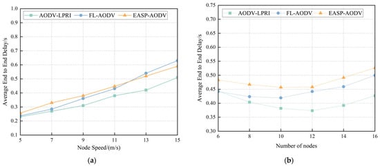 End-to-end delay refers to the average delay time for all data packets from the source node to the final successful reception of the data by the target node, which can be used to analyze the timeliness of routing. This section evaluates the impact of node mobility and network density on the average end-to-end delay of the three routing protocols.