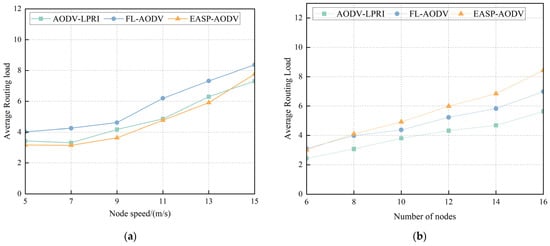 Figure 16a shows the comparison of routing load at different node movement speeds. As the topology changes dynamically, the average routing overhead of all three routing protocols keeps increasing. As the speed of node movement increases, the stability of the link decreases, so more control packet packets are required to assist in the transmission of data packets, resulting in an increase in routing overhead. However, the link availability acknowledgment mechanism is added to the AODV-LPRI protocol to increase the number of control packet packets, so the average routing cost of this protocol is higher than that of EASP-AODV. AODV-LPRI outperforms FL-AODV protocol when topology changes are more frequent. This is because AODV-LPRI establishes available routes through link availability, which reduces the frequency of route reconfiguration and has low maintenance costs.