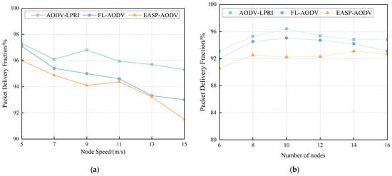 Packet delivery fraction refers to the proportion of packets received over a period of time to the total number of transmissions. The larger the packet delivery fraction, the better the integrity and accuracy of data transmission and the more reliable the network. This section evaluates the reliability of the three routing protocols by analyzing their packet delivery performance at different moving speeds and network densities.