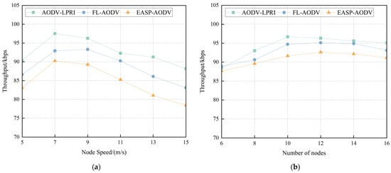Figure 18a demonstrates the network throughput performance comparison at different node movement speeds. It can be observed that the network throughput of the three protocols shows a decreasing state as the node movement speed increases. This is because when the topology changes frequently, the link quality decreases, which directly affects the success rate of packet transmission, thus leading to a decrease in network throughput. However, AODV-LPRI outperformed the other two protocols, with an average 4.43% increase in network throughput compared to the FL-AODV protocol. This performance advantage is due to the fact that AODV-LPRI introduces the link availability evaluation mechanism that monitors the link status in real-time and selects available routes based on