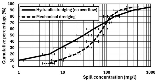 The LACS (Los Angeles Contaminated Sediments) Task Force (2003) [28] has analyzed the available data (40 to 50 cases) on the loss of sediments during dredging operations without overflow from various dredging studies in the USA and from the literature. Figure 1 shows the cumulative probability distribution of the loss/resuspension coefficient Rspill (%) on the horizontal axis of hydraulic (without overflow) and mechanical dredging methods.