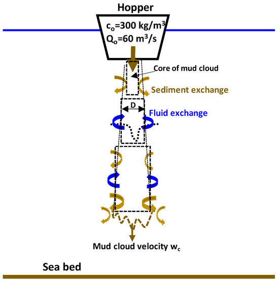 A mud cloud with initial volume Vc,o and initial mud concentration cc,o is assumed to fall from the surface to the seabed. The cloud is assumed to consist of a series of cylinders with diameter D and height αD (α in the range of 1 to 2), cloud velocity (wc) and cloud density (ρc) released from the hopper vessel (see Figure 3). The forces acting on the cloud are the gravity force (Fg), the buoyancy force (Fb), the drag (Fd) and the skin friction (Ff) forces. The diameter of each cylinder grows as the cloud volume decreases as the cloud is gradually diluted due to entrainment of water into the cloud. The sediment mass (Mc) of the cloud is reduced by spill concentrations separated from the cloud by the action of vortices. In the case of shallow depth conditions, a turbidity current along the bed is generated (Van Rijn, 2004 [38]).