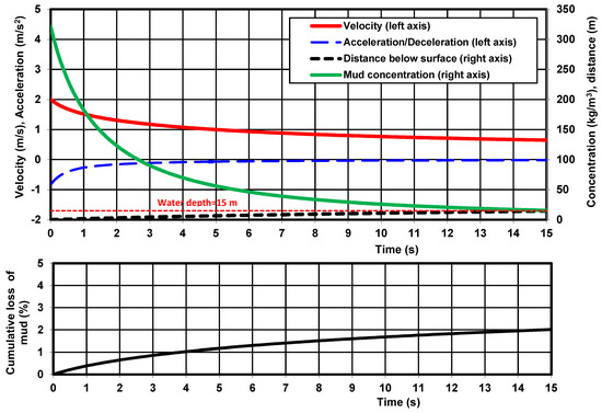An important process during the descent of the high-concentration sediment cloud (slurry) to the seabed is the entrainment of water into the cloud due to the generation of a thin boundary layer flow with shear stresses along the interface of the cloud producing small-scale turbulent eddies which bring clear water into the cloud and sediment out of the cloud into the boundary layer. By this entrainment and dilution processes with clear ambient water, the cloud volume of water and sediment increases strongly during descent, but at the same time the bulk cloud density decreases due to dilution. Bokuniewicz et al. (1978) [33] measured the lateral spread due to entrainment by using horizontally scanning echo-sounding equipment and found that the cloud volume impacting the seabed was 70 times greater than the initial released volume at a site with depths up to 45 m. In very deep water, there is a relatively long descent path, and thus more water can be entrained into the descending cloud, resulting in stronger dilution. Spill of fines (2% to 3% of the initial load) along the interface of the cloud may occur during the descent of the cloud. The spill is somewhat greater (>3%) at dump sites with strong tide-/wind-induced currents > 0.7 m/s due to interaction of current-related turbulence with the descending cloud. Strong currents also cause significant (but predictable) displacement of the descending cloud, particularly in the zone where the cloud is sufficiently decelerated (to the velocity of the ambient current) and the cloud concentration is substantially reduced to values below 10 kg/m3 and gradually becomes a passive cloud. Monitoring of mud concentrations during dredging operations generally show low mud concentrations in the range of 100 to 200 mg/L in the passive trailing plume at about 100 m from the source (Wolanski et al., 1992 [35]; Healy et al., 1999 [36,37]).