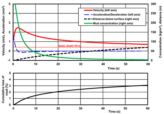 Bokuniewicz et al. (1978) [33] have studied the dumping process at various sites in the USA using echo-sounding equipment and various electronic sensors for velocity and concentrations. Their data show that the descent speed of a high-concentration cloud of fines is in the range of 1 to 3 m/s and strongly depends on the insertion speed, which is the initial speed of the cloud after release from the dredger. The descent speed is roughly 0.4 to 0.8 times the insertion speed. The water depth does not have much of an effect on the descent speed as long as the cloud is not disintegrated and behaves as dynamic plume (descent speed >> settling speed of individual cohesive particles/flocs/aggregates). The insertion speed can be derived from the emptying rate (discharge rate) and the open-door area of the hopper. The emptying rate depends on the type of dredged materials in the hopper load (density, load thickness), the geometry and the opening speed of the bottom doors. The insertion speed can, to some extent, be controlled by the dredge operator (door opening speed or area). A high insertion speed can be used to reduce the transit time (and minimize spill) to the seabed in conditions with a strong current and/or large depth. A low insertion speed can be used to increase the transit time, resulting in a smaller bed impact and bed surge.