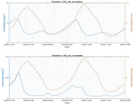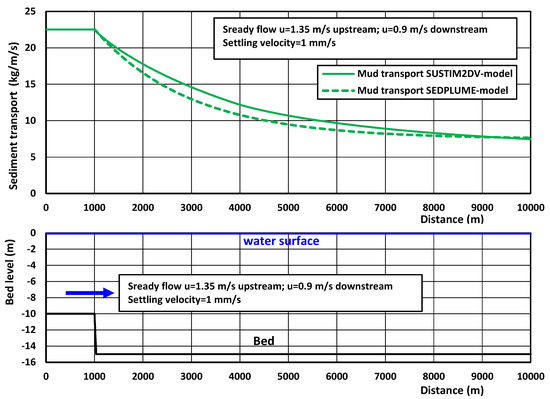 The results of the SEDPLUME1D-model as a function of distance for the flood phase of the tidal cycle with duration of 12 h (diurnal tide) are given in Figure 14 and Figure 15. The travel distance of a fluid particle with velocity of 0.5 m/s over the flood phase of 12 h (diurnal tide) is 0.5 × 12 × 3600 ≅ 20 km.