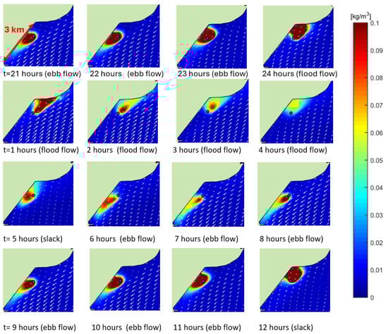The local tidal cycle is represented as 2 periods (each with duration of 12 h; diurnal tide of 24 h; flood = 12 h; ebb = 12 h) with quasi-constant flow velocities uflood and uebb. The initial concentration co,flood at some distance (about 50 to 100 m) is computed as follows:
