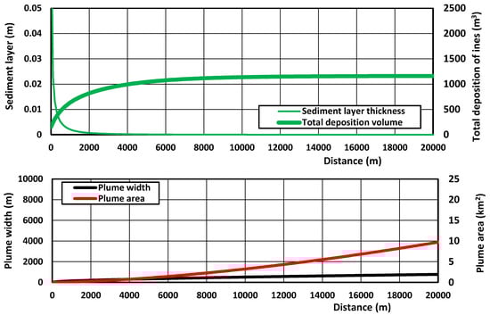 Sediment layer thickness, deposition volume, plume width and plume area as a function of distance.
